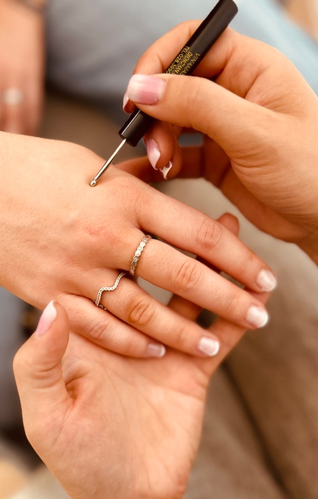 J’utilise mes divers outils ( stylet, roulettes, jumbos, mains, patchs…) pour stimuler les zones du visage et du corps.